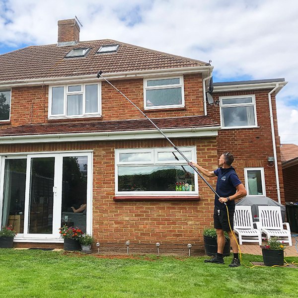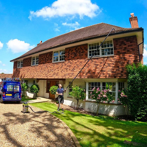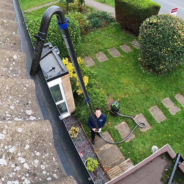 Yes — our advanced pole system reaches up to 12 metres, easily clearing gutters above extensions, garages, and conservatories.