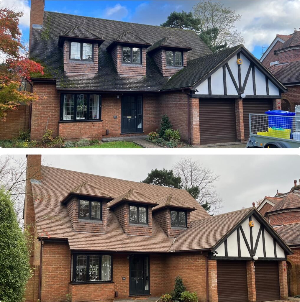 We use a mixture of methods depending on the tiles and customers request. We offer low pressure washing which gives amazing results removing moss and softly cleaning the tiles giving an instant clean result. We also offer the scraping method (dry method), brushing all the moss down using profiled blades and brushes. Then we offer a chemical wash too in order to thoroughly clean the roof and remove the moss poures and organic growth.